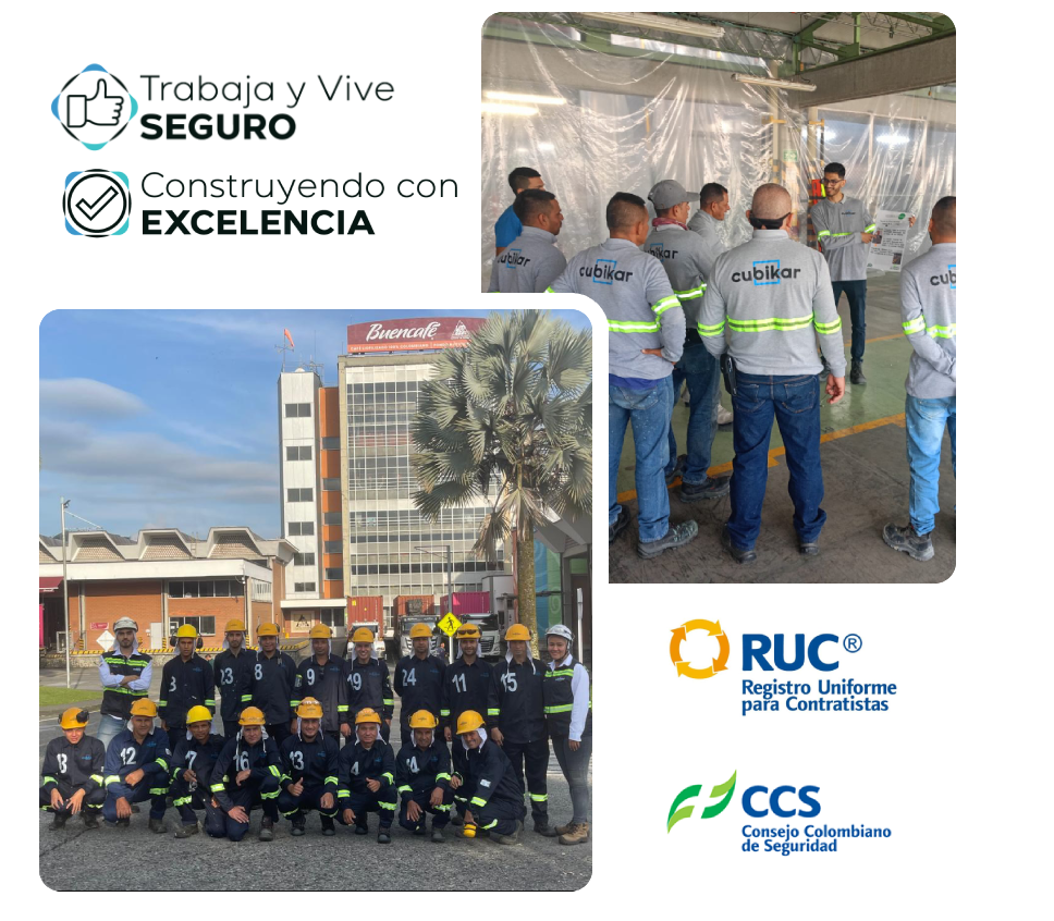 Desde el 2023, CUBIKAR S.A.S logró la Certificación del Sistema de Gestión de SST-MA, por medio del RUC (Registro Uniforme para Contratistas), certificado que otorga el Consejo Colombiano de Seguridad en Colombia, y que tenemos vigente con una calificación superior al ochenta y siete por ciento para vigencia 2.026, por encima del promedio nacional de empresas de construcción.